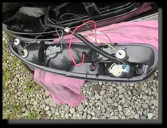 泣く泣く配線計画変更。ウインカー用の配線には、どうしても純正バルブが付いていないと点滅してくれないので、分岐して両方を配線。赤とオレンジ両方点滅になっちゃいました。 |