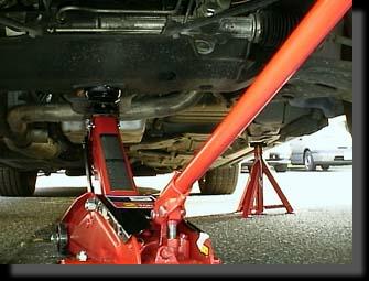 油圧ジャッキを前輪のハウジング下に当てて、車を持ち上げようと思ったら、車体が低すぎてジャッキが入りません。仕方がないので、横をジャッキアップして馬をあててから、ジャッキ挿入。反対側の横にも馬をかませました。しかし、安物のジャッキだと、パイプが短くて持ち上げるのが大変です。 |